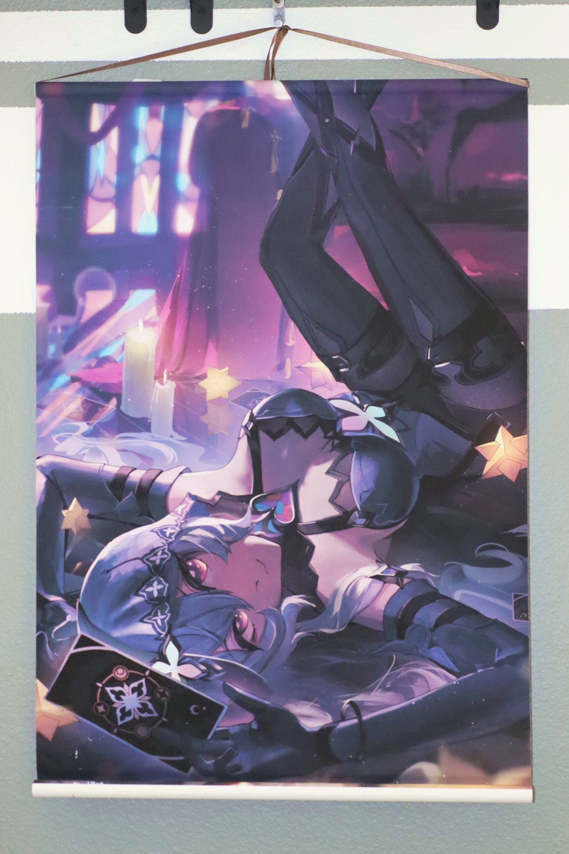 - 20" x 30" Printed on Silk. Attached to two plastic rolls, string included on top.