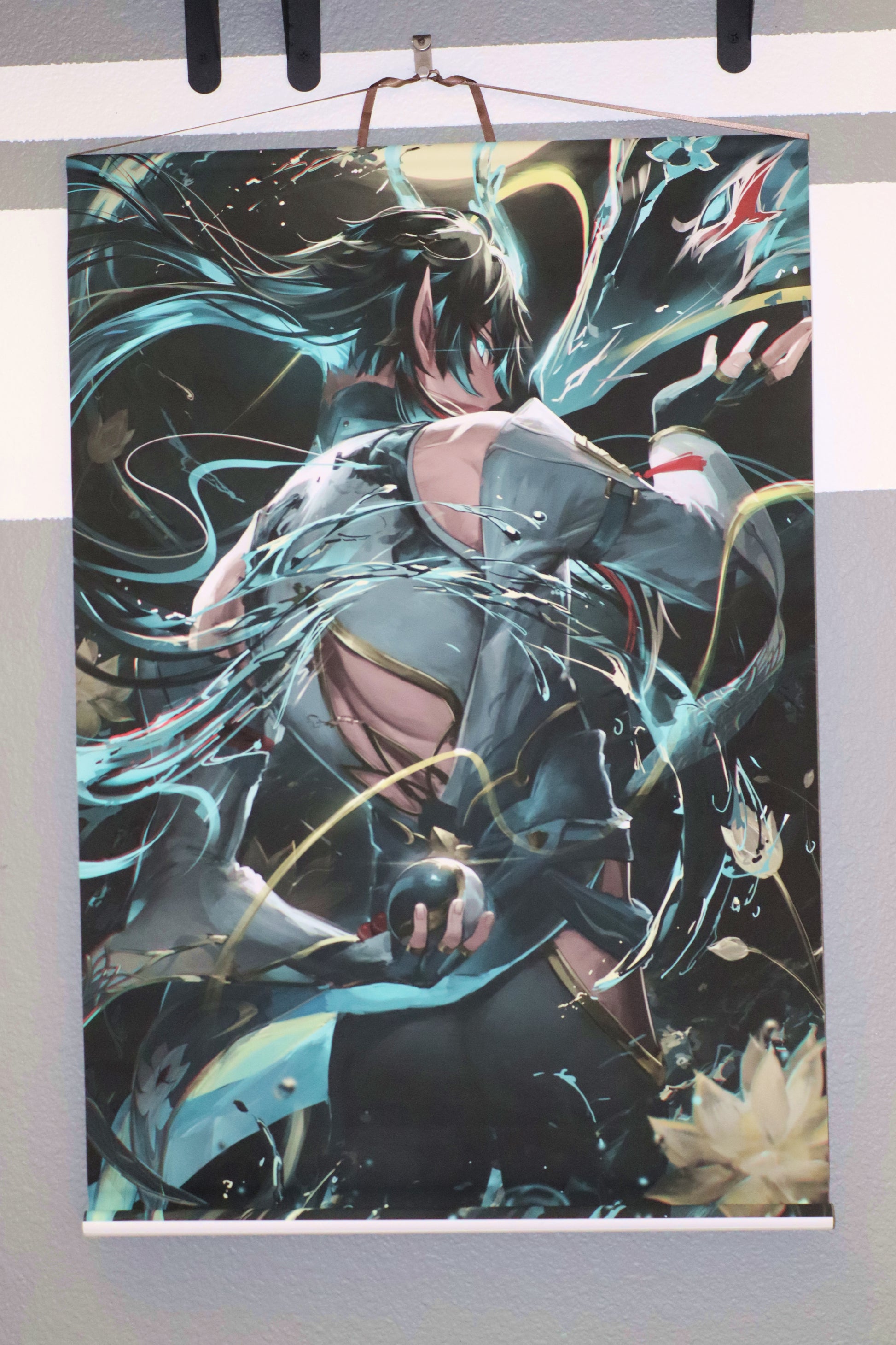 - 20" x 30" Printed on Silk. Attached to two plastic rolls, string included on top.