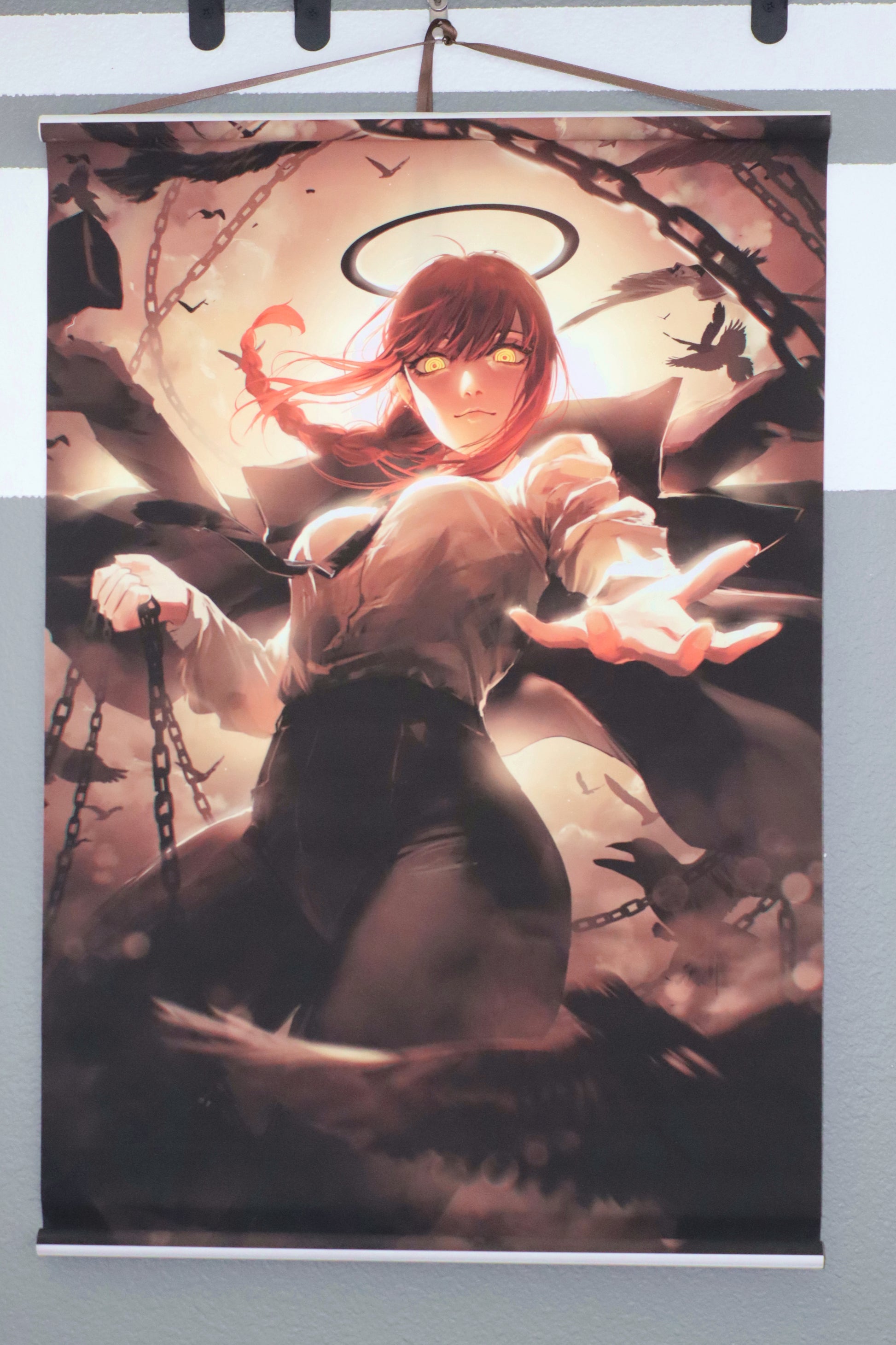 - 20" x 30" Printed on Silk. Attached to two plastic rolls, string included on top.