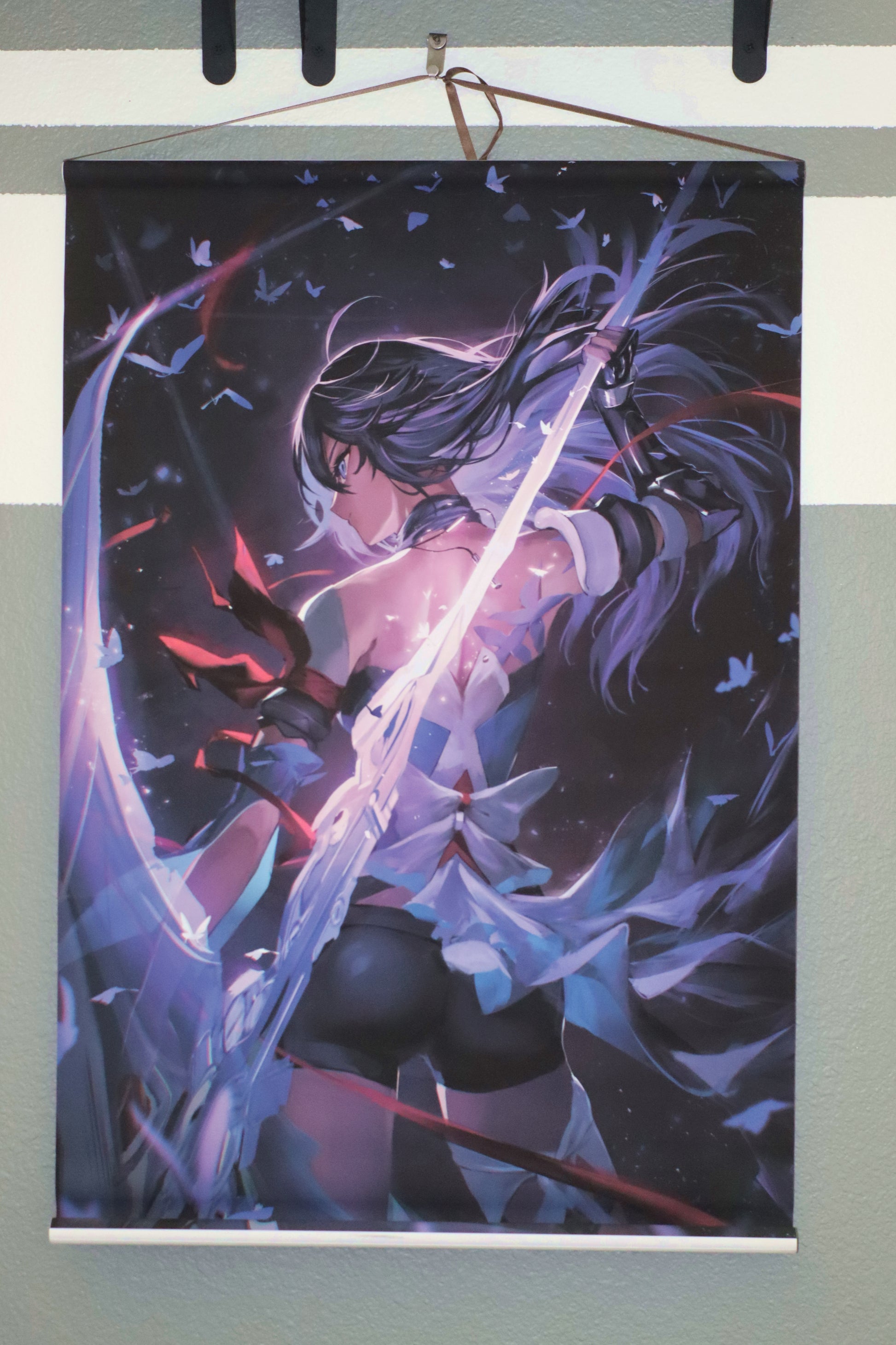 - 20" x 30" Printed on Silk. Attached to two plastic rolls, string included on top.